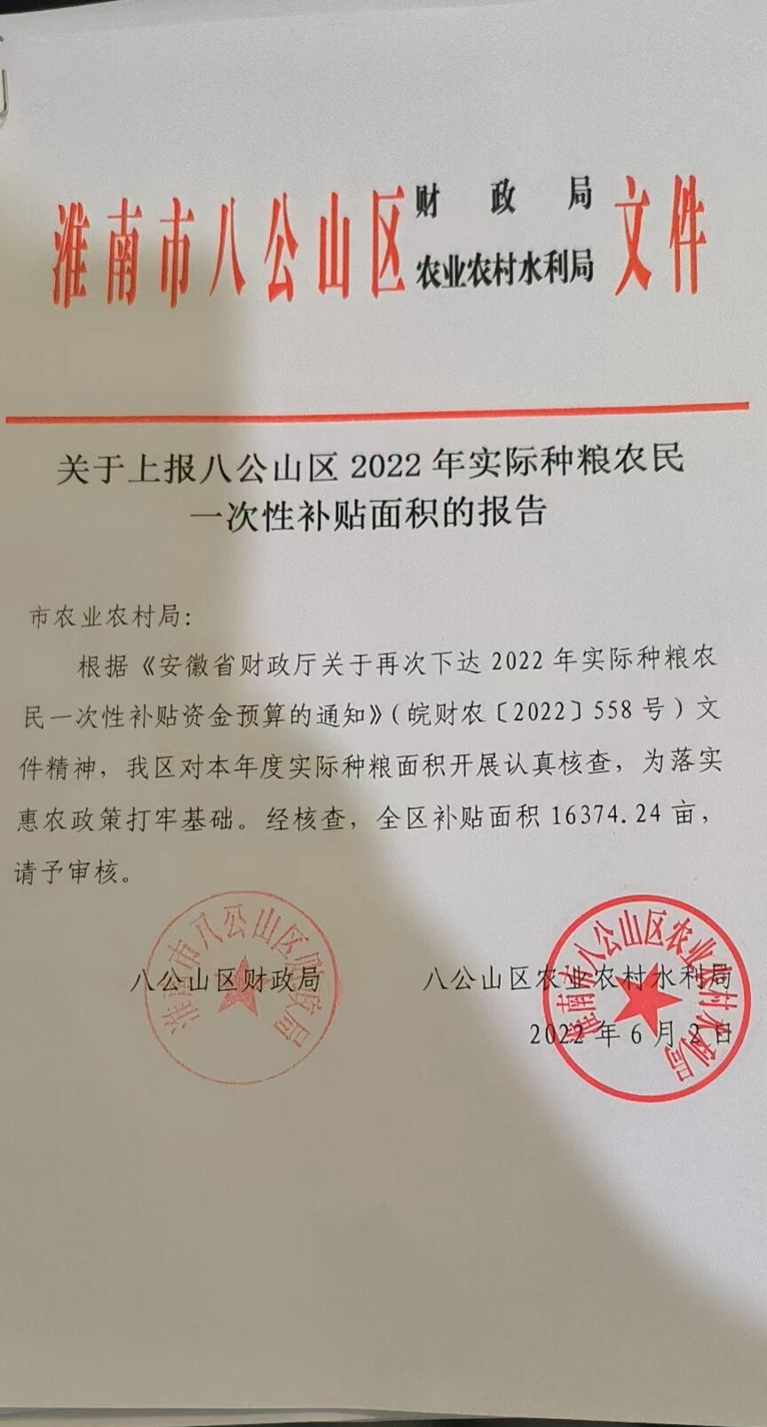 八公山区2022年实际种粮农民一次性补贴面积的报告