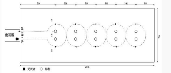 (1)平整的人工草或天然草足球场,划定25米×5米区域。起点距第一个杆距离4米,其余杆距2米,起点距终点20米,测试过程出现以下现象均属犯规行为,取消当次成绩:出发时抢跑、漏绕标志杆、碰倒标志杆、故意手球、未按要求完成全程路线等。