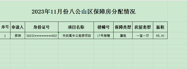 2023年11月份八公山区保障房分配情况