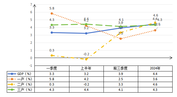 (一)“三次产业”支撑不足,GDP增速慢于全市。2024年,GDP同比增长4.4%,较前三季度提升0.5个百分点,位次前移2位,但仍未跑赢全市。分产业看:一产拉动力偏弱。全年一产增加值同比增长3.6%,高于全市增速1个百分点,但占地区生产总值比重为2.1%,拉动GDP增长仅有0.1个百分点。二产增长低于全市。全年二产增加值同比增长4.6%,低于全市0.8个百分点。主要是因为规上电力、热力、燃气及水生产和供应业增加值同比下降62.1%,整体增加值下降55.4%,下拉GDP1.5个百分点。三产提速不快。全年三产增加值同比增长4.3%,较前三季度提升0.2个百分点,但慢于全区GDP增速。其中,批发业、零售业、住宿业、房地产业、非营利性服务业和交通运输、仓储和邮政业等6大行业分别低于全区GDP1.2、1.5、1.7、1、2.7、2.3个百分点。