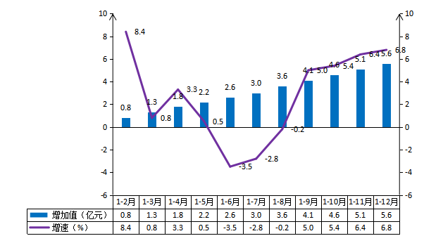 1-12月份,全区规模以上工业完成总产值19.5亿元,同比下降13.8%;完成增加值5.6亿元,同比增长6.8%,增速高于全市平均水平7.5百分点,居六区两县第3位。