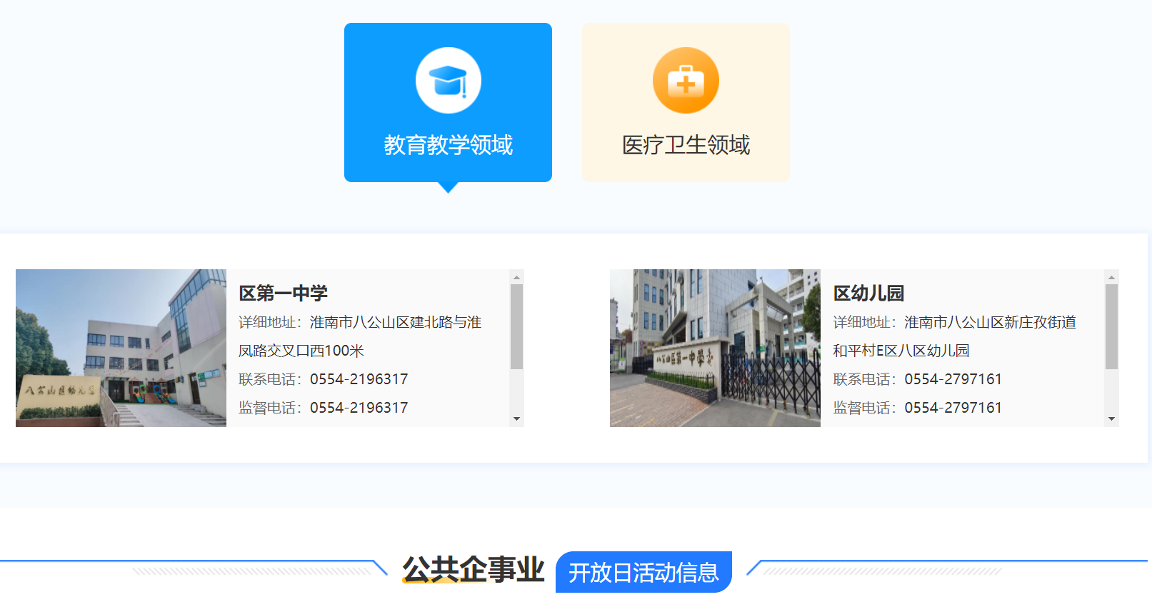 区政府办公室定期召开八公山区企事业单位政务公开培训会,组织学习《安徽省教育领域公共企事业单位信息公开指引目录》及《安徽省医疗卫生机构信息公开目录》,定期对企事业单位政务公开栏目进行检查。同时按照市政务公开办公室要求,及时对专题进行改版,增加公开制度、价格标准、便民公告、工作动态、集成服务链接等板块,在每个公开主体首页增加了图片、地址、咨询投诉电话等。