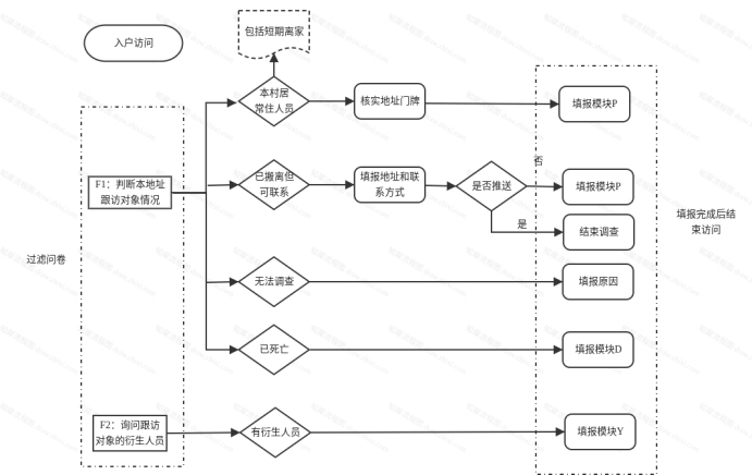 调查表分为过滤模块F表,跟访对象模块P表、D表, 儿童模块C表,衍生人员模块Y表。