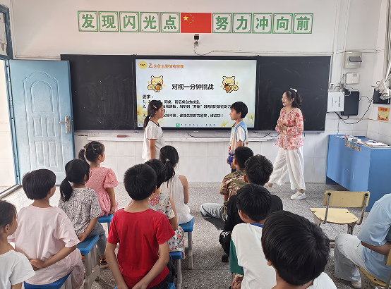 在心理健康主题班会中,老师向全体学生渗透不同方面的心理健康教育知识,帮助学生进一步了解生命的意义和价值,引导学生知道什么是情绪,如何调节好自己的情绪,并列举小学生常见的心理问题及提出情绪管理的方法,还通过游戏来引导学生管理自己的情绪,能以积极乐观的心态面对困难和挫折。随后,老师带着学生们开展心理健康团辅活动,针对小学生心理特点,制定了对视一分钟挑战、谁是卧底等趣味十足的游戏。