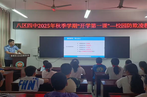 2025年9月1日下午,来自八公山区山王镇派出所的蒋凯文警官为六年级的学生上了一堂精彩的“开学第一课”---防欺凌法治教育课。旨在营造安全、健康的校园环境,增强学生安全防范意识和自我保护能力。