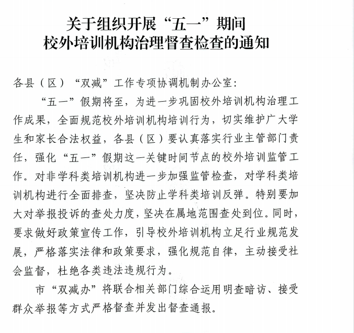 关于组织开展“五一”期间校外培训机构治理督查检查工作