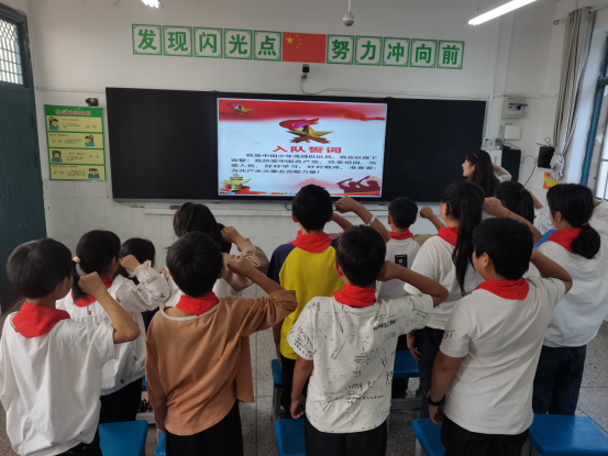 大队辅导员陈老师带领全体少先队员唱《中国少年先锋队队歌》,引导学生知道少先队的队名、少先队的创立者和领导者、队旗和队徽的含义、少先队员的标志、少先队的作风等少先队知识。随后,陈老师教同学们如何正确佩戴红领巾和敬队礼,带着全体少先队员重温入队誓词,一句句誓词在队员们心中埋下了爱党、爱国的种子。伴随着退旗曲的响起,护旗手护送着中国少年先锋队队旗庄重退场,少先队建队仪式圆满结束。
