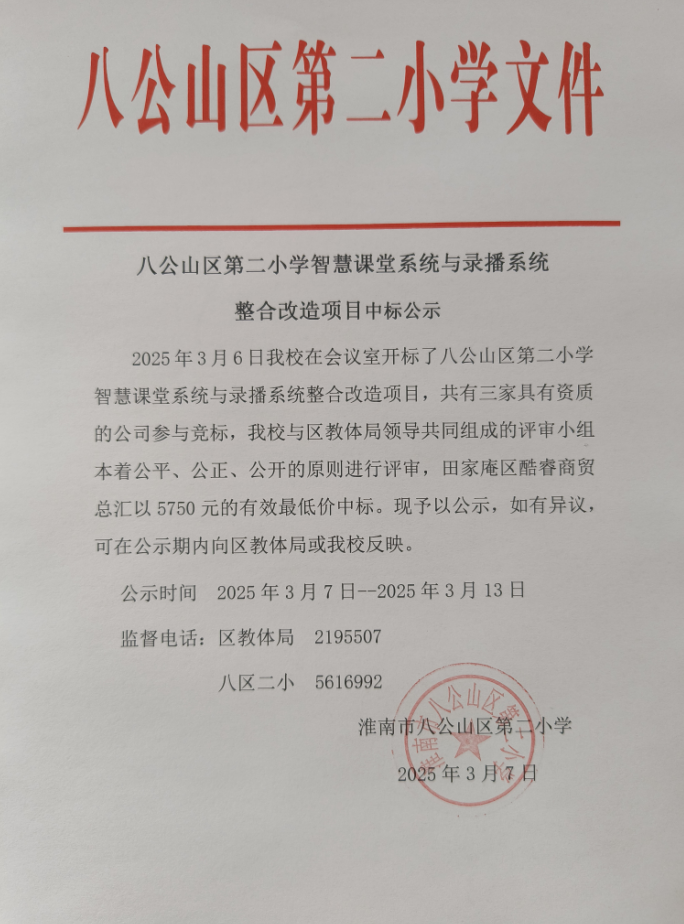 八公山区第二小学智慧课堂系统与录播系统整合改造项目中标公示