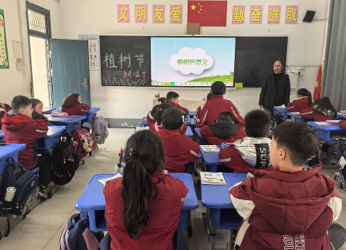 升旗仪式上,学生利用国旗下讲话进行有关“植树节”知识的宣传,发出号召,希望人人参与植树节护绿、养绿系列活动,为美化、净化校园环境尽一份力。主题队会课上,辅导员老师通过视频讲解、知识竞答、环保故事分享等形式,让同学们学习植树节的由来、树木对生态环境的作用以及低碳生活小妙招。美术课上,老师带领小朋友通过绘画认识身边的小树,了解绿化环保小知识。同学们利用课间给校园里的花草树木浇水,以“图”“画”结合的方式为爱护花草树木设计简洁大方、色彩鲜明的广告标语,成为小树的“监护人”。