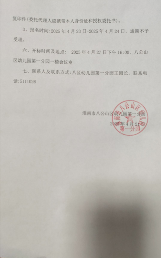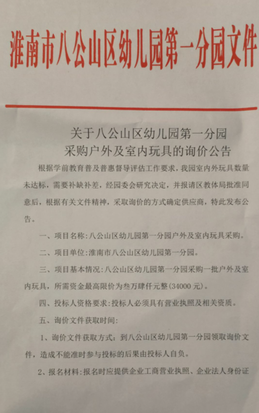 关于八公山区幼儿园第一分园采购户外及室内玩具的询价公告