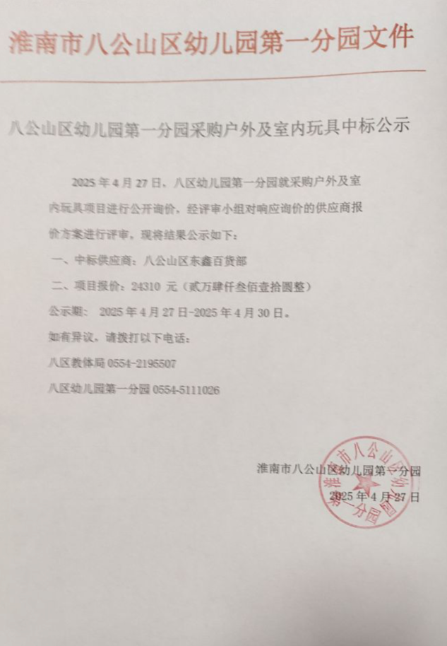 八公山区幼儿园第一分园采购户外及室内玩具中标公示