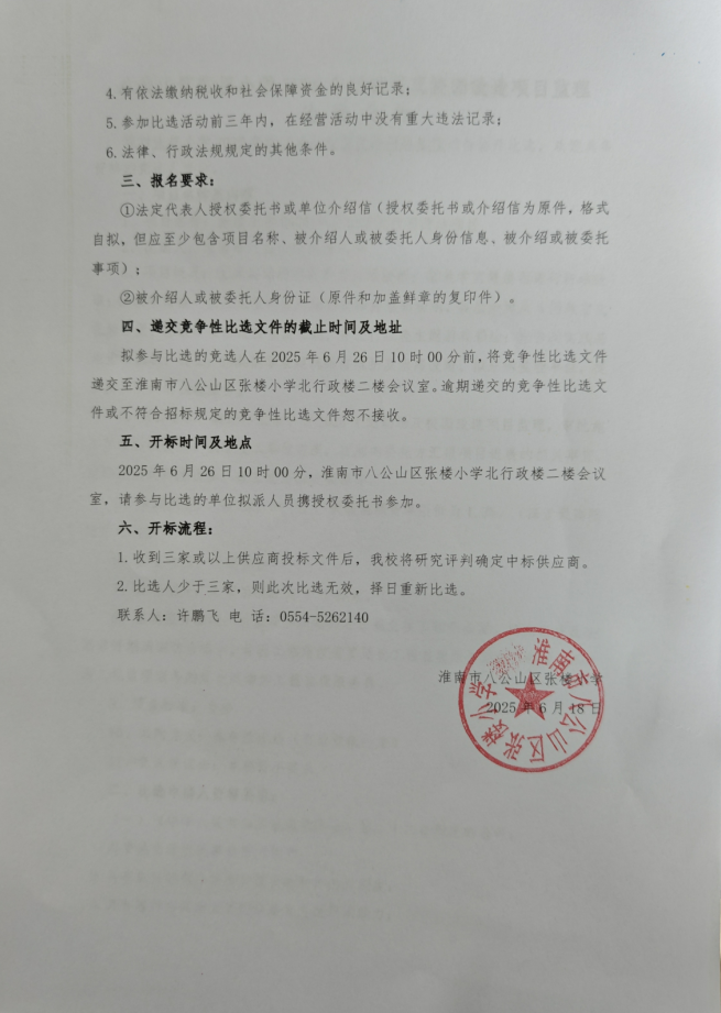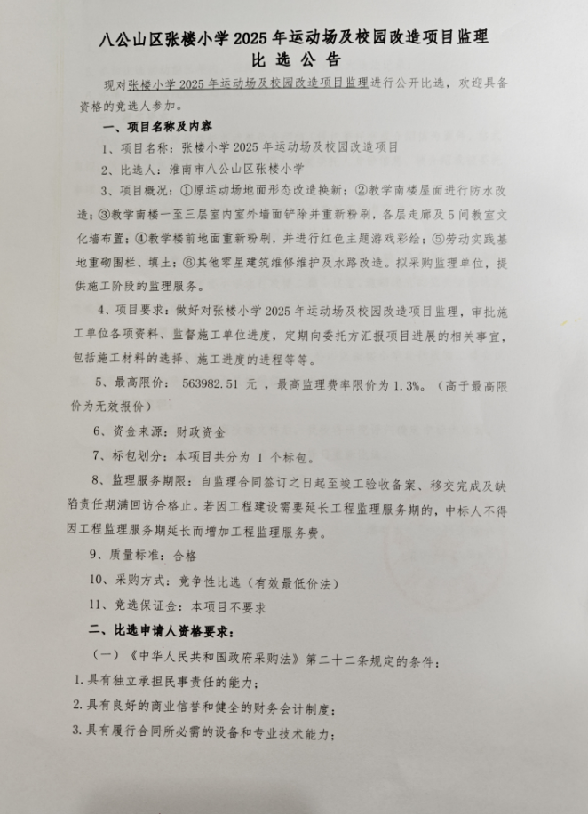 八公山区张楼小学2025年运动场及校园改造项目监理比选公告