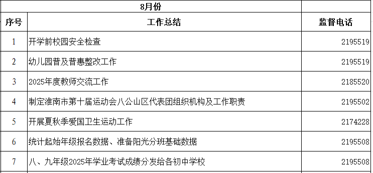 八公山区教体局2025年8月份重点工作完成情况