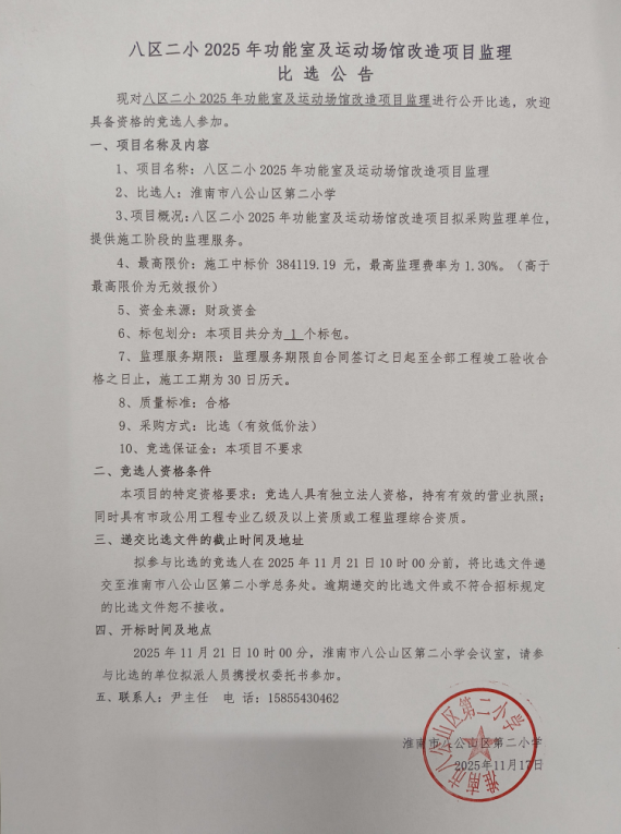 八区二小2025年功能室及运动场馆改造项目监理比选公告