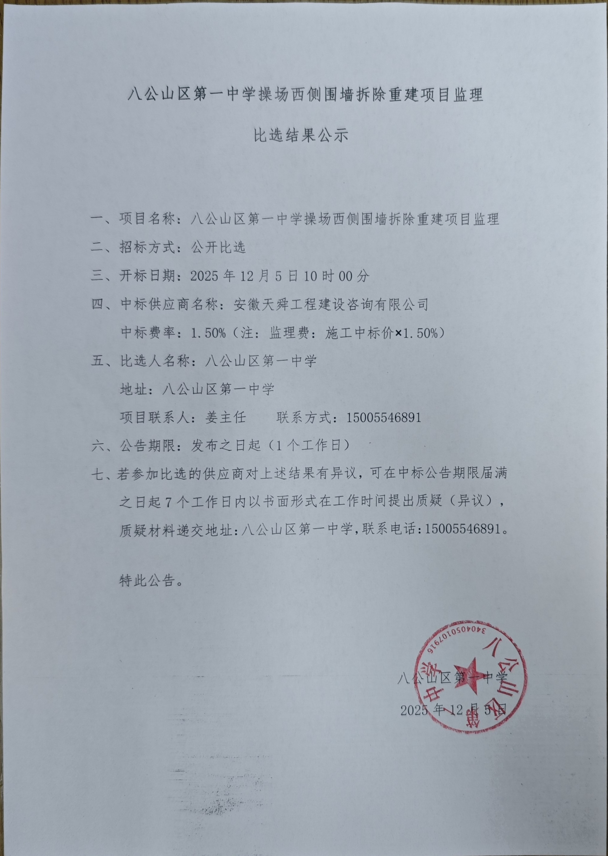 八公山区第一中学操场西侧围墙拆除重建项目监理比选结果公示