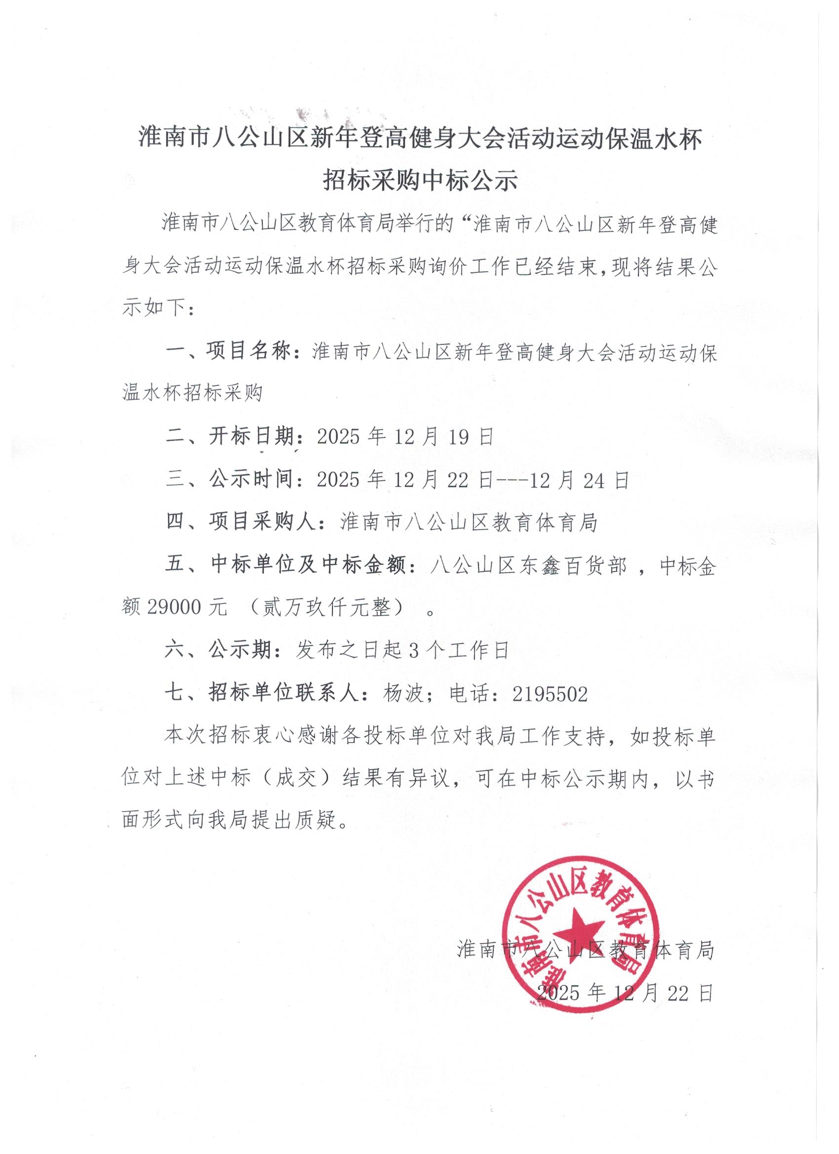 淮南市八公山区新年登高健身大会活动运动保温水杯招标采购中标公示