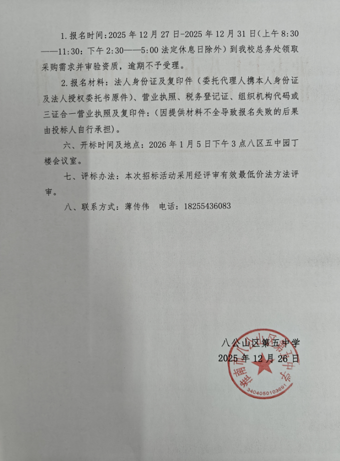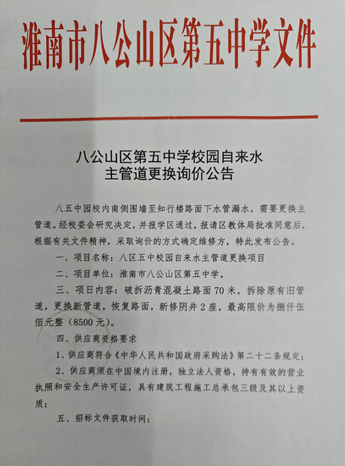 八公山区第五中学校园自来水主管道更换询价公告