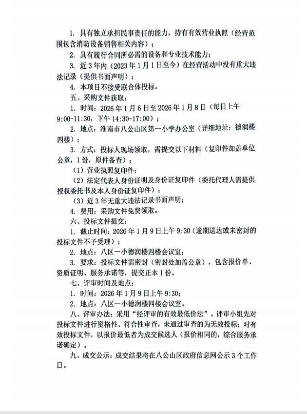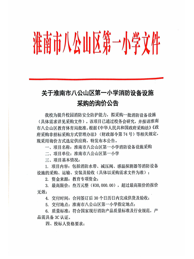 关于淮南市八公山区第一小学消防设备设施采购的询价公告
