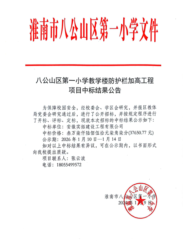 八公山区第一小学教学楼防护栏加高工程项目中标结果公告