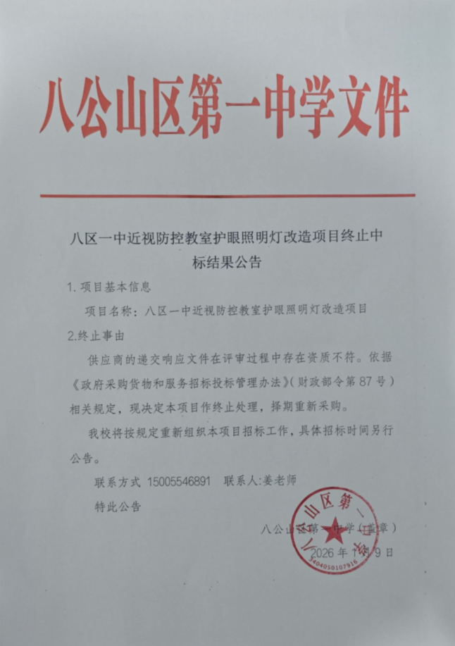 八区一中近视防控教室护眼照明灯改造项目终止中标结果公告