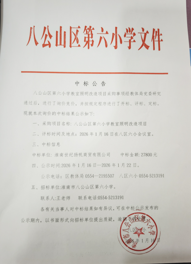 八公山区第六小学教室照明改造项目中标公告