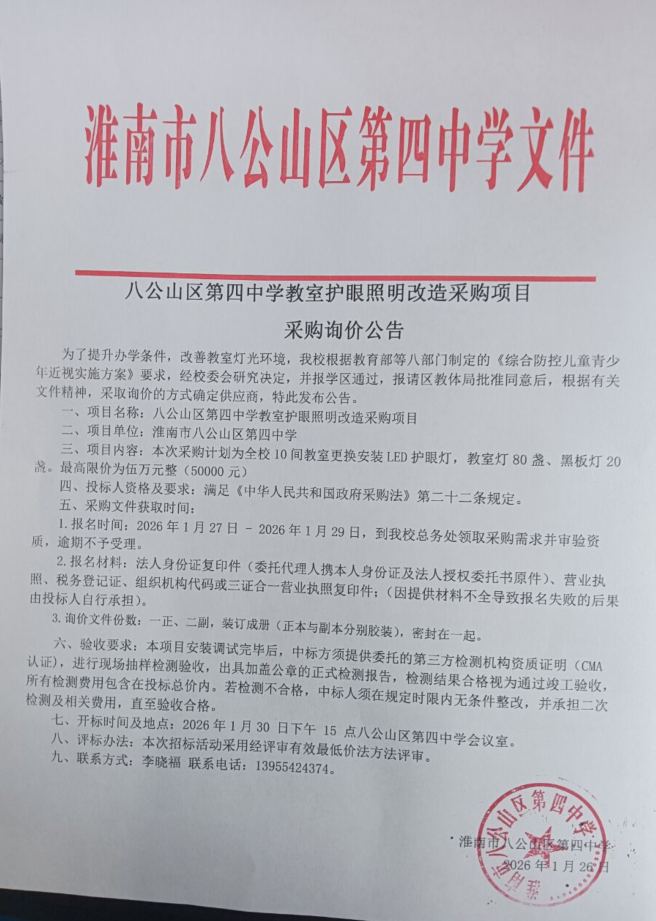 八公山区第四中学教室护眼照明改造采购项目采购询价公告