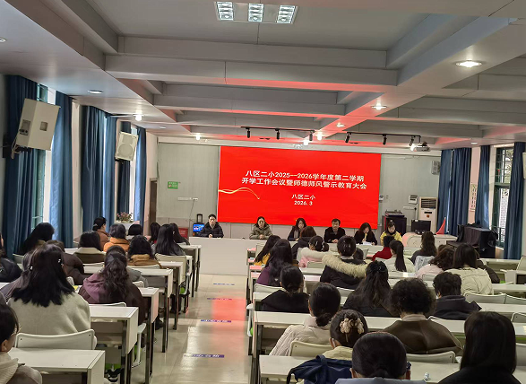 3月2日上午,八区二小召开2025-2026学年度第二学期开学工作会议暨师德师风警示教育大会。全校教职工全员参会,校领导班子主持并部署相关工作。
