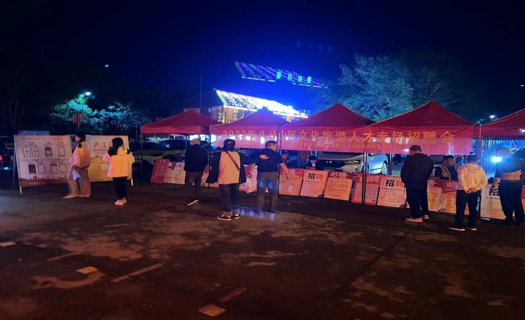 为了深入提升就业服务质量,强化招聘就业服务,八公山区创新招聘形式,充分利用八公山区文化旅游节,游客众多,人流量集中,以“旅游+招聘”为特色,开展“2+N”招聘服务。国庆期间,八公山区公共就业管理服务中心在八公山区国家地质公园北门广场举办了“八公山区2023年文化旅游人才夜场招聘会”、“ 2023年八公山区2+N招聘暨采煤沉陷区专场招聘会”,吸引了大量前来游玩者及各类求职者前来咨询应聘。