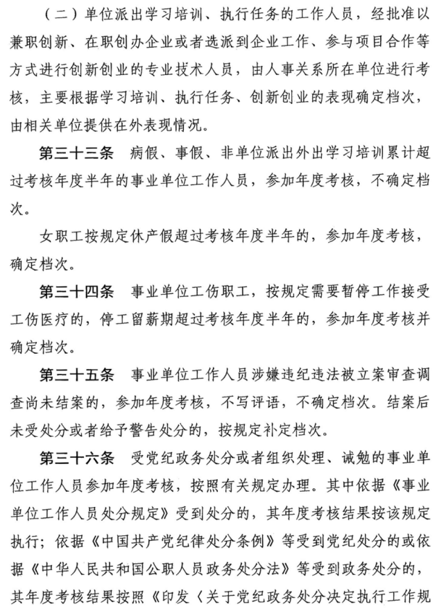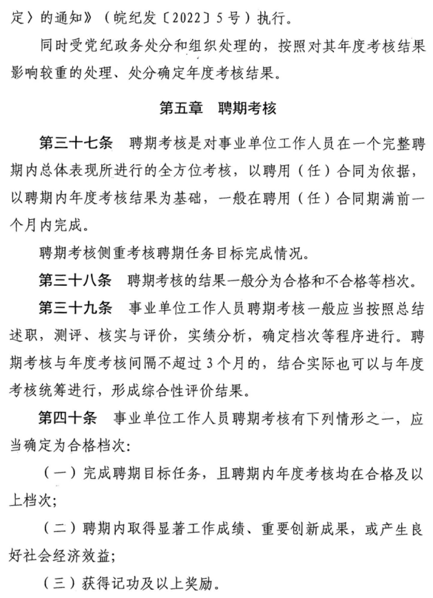 (二)受到处分的事业单位工作人员,其年度考核有关事宜,分别按以下规定执行:依据《事业单位工作人员处分规定》受到处分的,其年度考核结果按该规定执行;依据《中国共产党纪律处分条例》等受到党纪处分的或依据《中华人民共和国公职人员政务处分法》等受到政务处分的,其年度考核结果按照《印发〈关于党纪政务处分决定执行工作规定〉的通知》(皖纪发〔2022〕5号)执行。