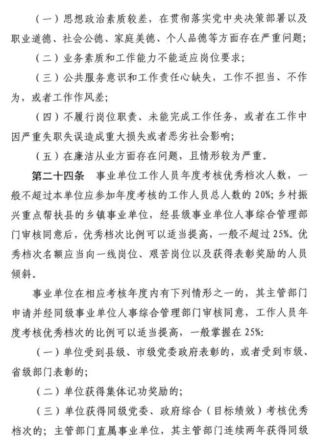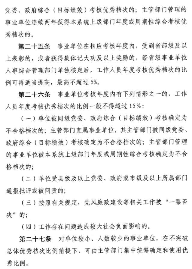 事业单位工作人员年度考核优秀档次人数,一般不超过本单位应参加年度考核的工作人员总人数的20%。事业单位存在《考核细则》第二十四条或第二十五条规定情形的,其工作人员年度考核优秀档次的比例可以适当提高。事业单位存在《考核细则》第二十六条规定情形的,其工作人员年度考核优秀档次比例一般不超过15%。对单位较小、人数较少的事业单位,在不突破总体优秀档次比例前提下,考核结果报送至区人社局后统筹参加二次测评。