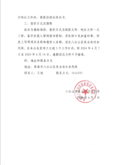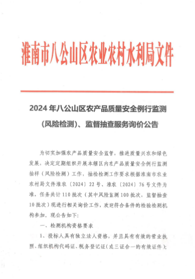 2024年八公山区农产品质量安全例行监测(风险检测)监督抽查服务询价公告