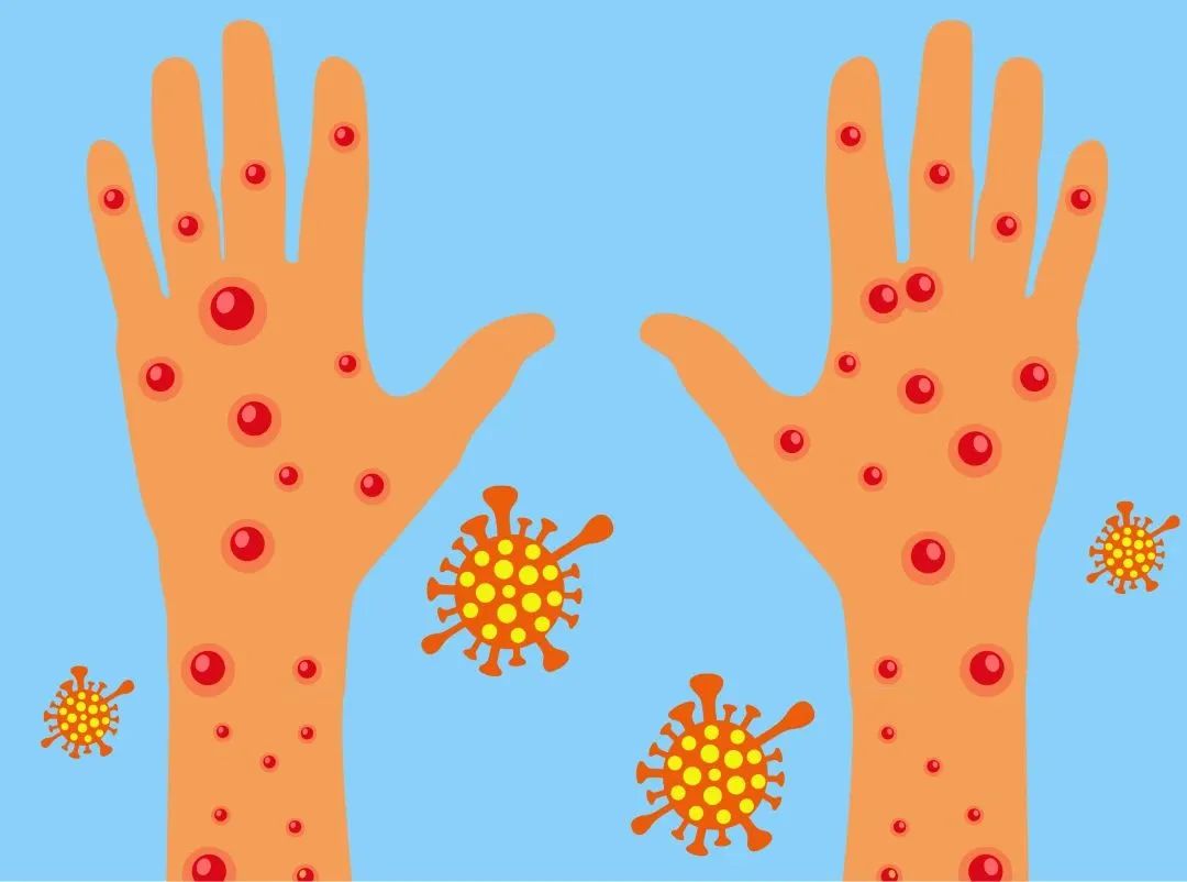 皮疹经历从斑疹、丘疹、疱疹、脓疱和结痂几个阶段,不同形态的皮疹可同时存在。疱疹和脓疱疹多为球形,直径约 0.5-1厘米,质地较硬,可伴明显痒感和疼痛。疱疹数量从几个到数千个不等,多呈离心性分布。可累及口腔黏膜、消化道、生殖器、结膜和角膜等。病程约 2-4 周。