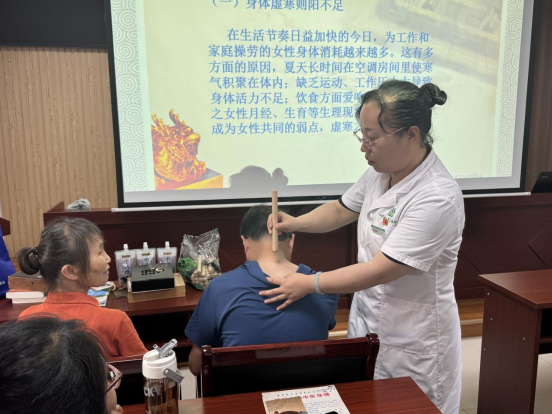 活动现场,医务人员进行了中医药知识讲座,详细讲解了《中医药法》、中医药文化、中医保健知识等内容,与群众面对面沟通交流。并现场进行中医义诊,医务人员运用望、闻、问、切四诊法,为群众进行中医辨证,并免费为群众进行刮痧、艾灸等中医适宜技术。活动现场给每位参与活动的群众准备了手工熬制的酸梅汤,发放了《九种体质中医调养》、《高血压的中医防治知识》、《糖尿病的中医保健》、《中医药法律法规知识》等宣传折页100余份。