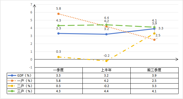 (二)三次产业发展缓慢,地区生产总值仍需提速。与上半年相比,前三季度GDP增速提升0.7个百分点,但仍然低于全市水平。分三大产业看,一产增幅回落。前三季度,农业总产值同比增长2.7%,较上半年回落1.4个百分点,导致一产增加值同比增长2.5%,回落1.7个百分点,拉动GDP增长仅有0.1个百分点。二产增速低于GDP。前三季度,第二产业由减转增,但仍然低于全区生产总值0.6个百分点。其中,工业中的规上电力、热力、燃气及水生产和供应业增加值同比下降58.9%,行业增加值下降29.2%,下拉GDP增速0.9个百分点。三产拉动力下滑。前三季度,第三产业同比增长4.1%,较上半年回落0.3个百分点,拉动力下滑0.2个百分点。部分行业发展放缓,批发业、交通运输仓储和邮政业、住宿业、非营利性服务业分别低于三产增速4、2.2、1.5、3个百分点,水利、环境和公共设施管理业低位运行。
