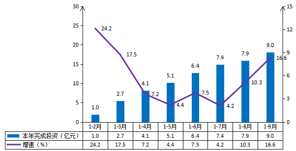 图三:1-9月份固定资产投资分月投资额及增速情况图