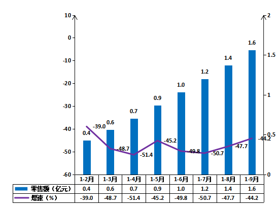 图四:1-9月份限额以上消费品分月零售额及增速情况图