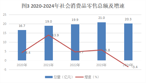 全年社会消费品零售总额20.3亿元,比上年下降3.4%。按行业统计,批发业销售额增长4%,零售业销售额增长2.7%,住宿业营业额增长2.3%,餐饮业营业额增长9.9%。
