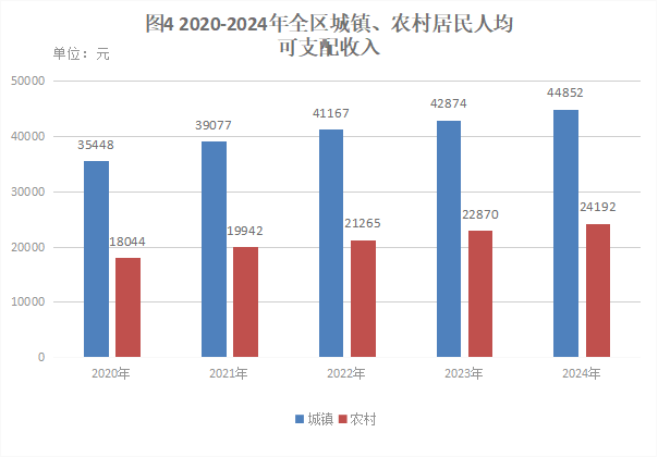 全年全区城镇居民人均可支配收入44852元,比上年增长4.6%;人均消费支出20960元,增长4.4%。农村居民人均可支配收入24192元,比上年增长5.8%;人均消费支出19182元,增长6%。