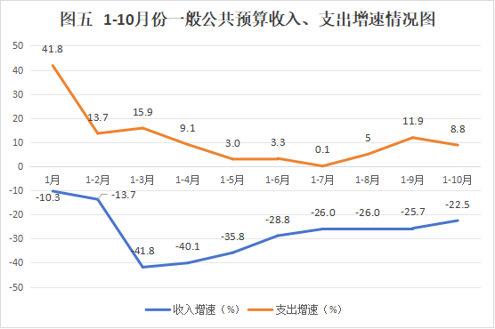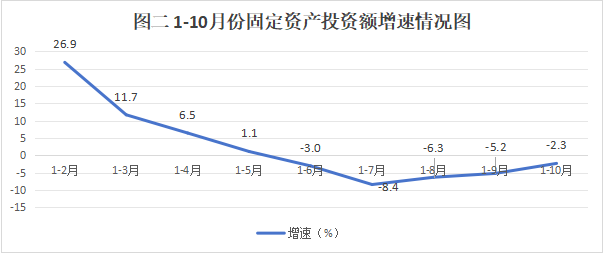 (二)固定资产投资承压下行。一是一产投资动力偏弱。1-10月份,第一产业投资同比增长107.5%,但投资额占全区比重为5.1%,仅上拉投资增速2.6个百分点。二是二产投资支撑不足。第二产业投资额占全区比重达到一半,但增速不快(2.8%),仅上拉投资增速1.3个百分点。其中,技改投资同比下降8.5%,下拉全区投资增速1.8个百分点。三是三产投资持续负拉动。1-10月份,基础设施投资同比增长3.8%,上拉投资增速1个百分点,但房地产开发投资降幅近四成,下拉投资增速6.9个百分点,导致第三产业投资下降12.3%,下拉全区投资增速6.2个百分点。