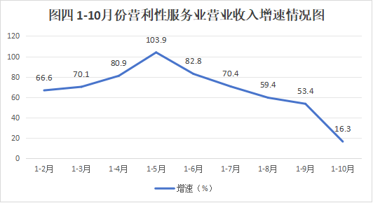 1-10月份,全区规模以上服务业营业收入同比增长20.2%。其中,营利性服务业营业收入同比增长16.3%,较1-9月份回落37.1个百分点。三类行业同步增长。其中,商务服务业营业收入同比增长25.4%,教育业营业收入同比增长82.2 %,文化艺术业营业收入同比增长2.7%。