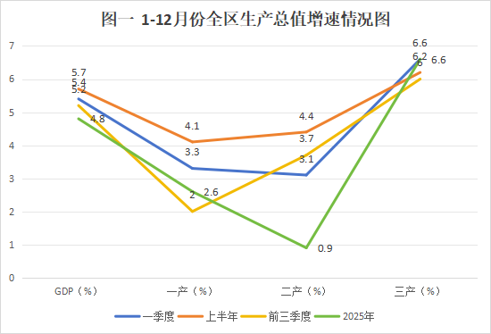 经初步核算,2025年全区实现生产总值46.1亿元,按可比价格计算,同比增长4.8%,增速高于全市平均水平0.2个百分点,居六区两县第5位。分产业看,第一产业增加值0.9亿元,同比增长2.6%,增速居六区两县第7位;第二产业增加值12亿元,同比增长0.9%,增速居六区两县第6位;第三产业增加值33.2亿元,同比增长6.6%,增速居六区两县第6位。三次产业结构调整为2:25.9:72.1。