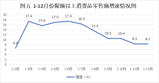 1-12月份,全区社会消费品零售总额23.6亿元,同比增长6.1%,增速高于全市平均水平1.1个百分点,连续三个季度位居六区两县第1位。其中,限额以上消费品零售额同比增长8.2%,高于全市平均水平0.9个百分点,大小口径均居六区两县第5位。