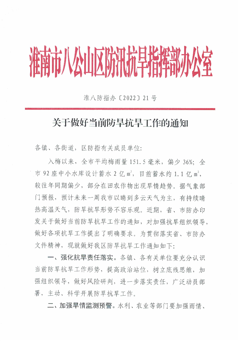 | 名称: | 八公山区防汛抗旱指挥部办公室《关于做好当前防旱抗旱工作的通知》 |