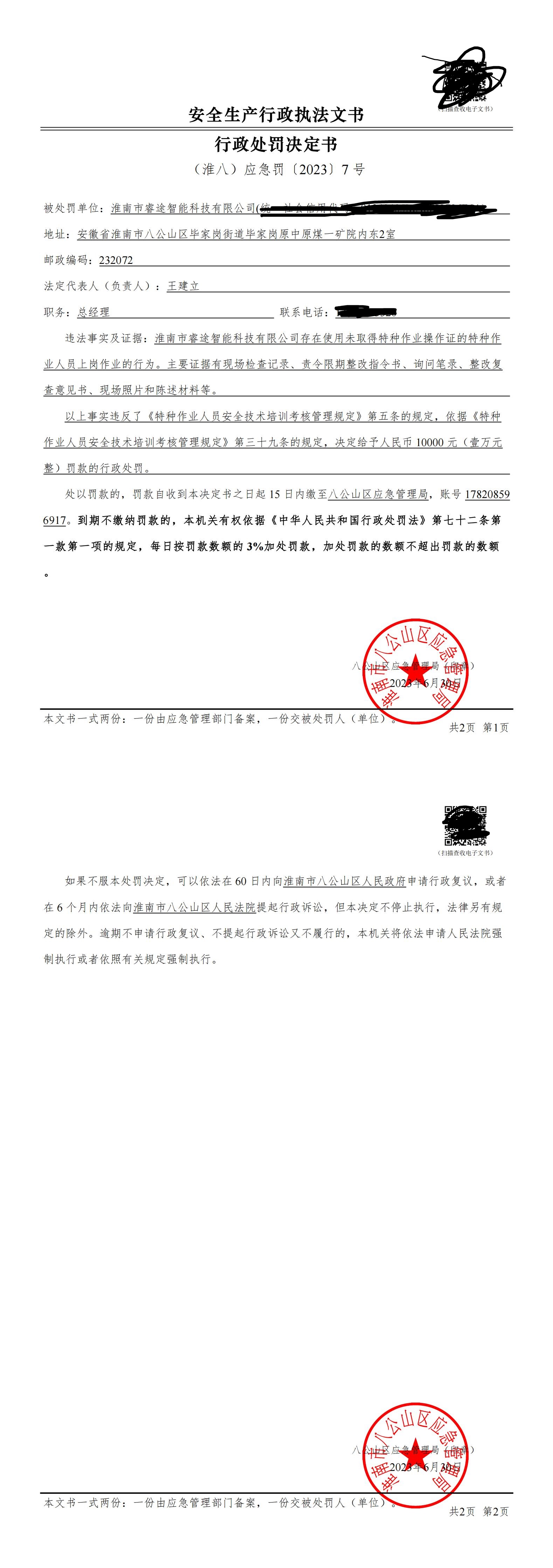 行政处罚决定书(个人)(淮八)应急罚〔2023〕7号
