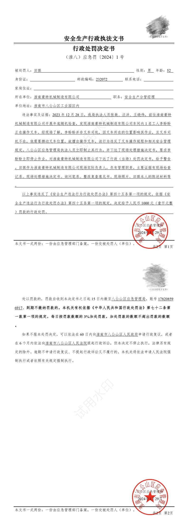 行政处罚决定书(个人)(淮八)应急罚〔2024〕1号