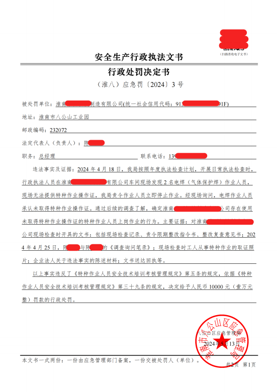 行政处罚决定书(个人)(淮八)应急罚〔2024〕3号