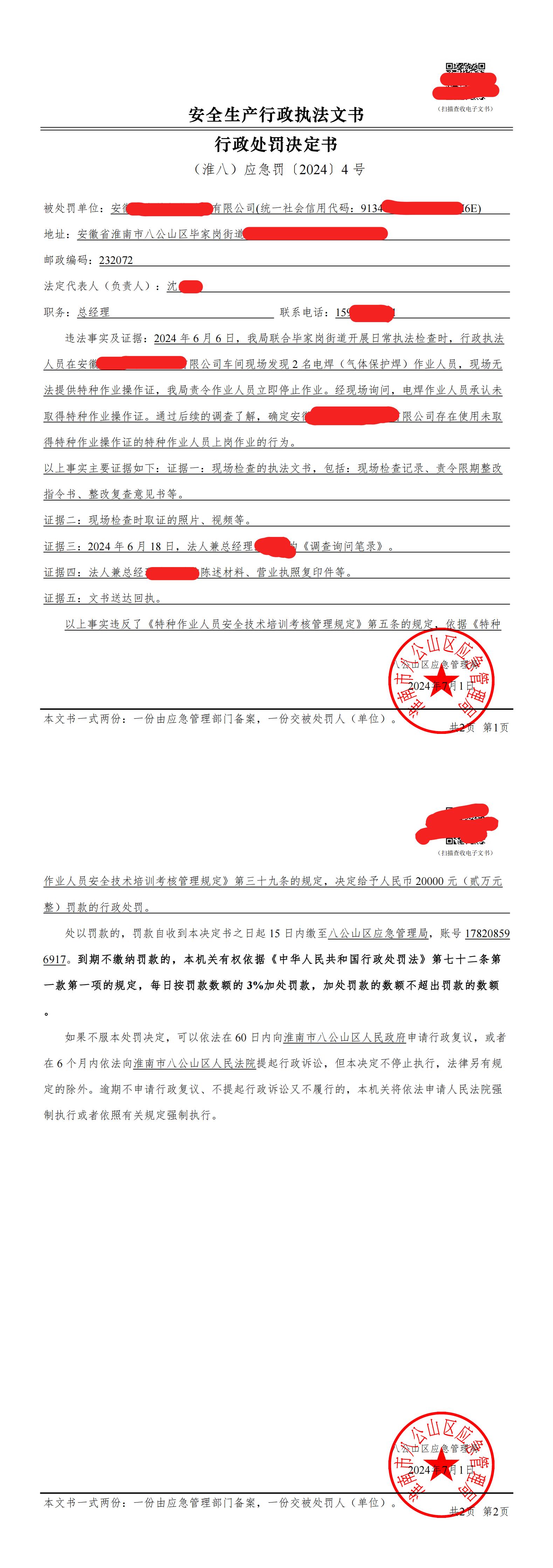 行政处罚决定书(个人)(淮八)应急罚〔2024〕4号