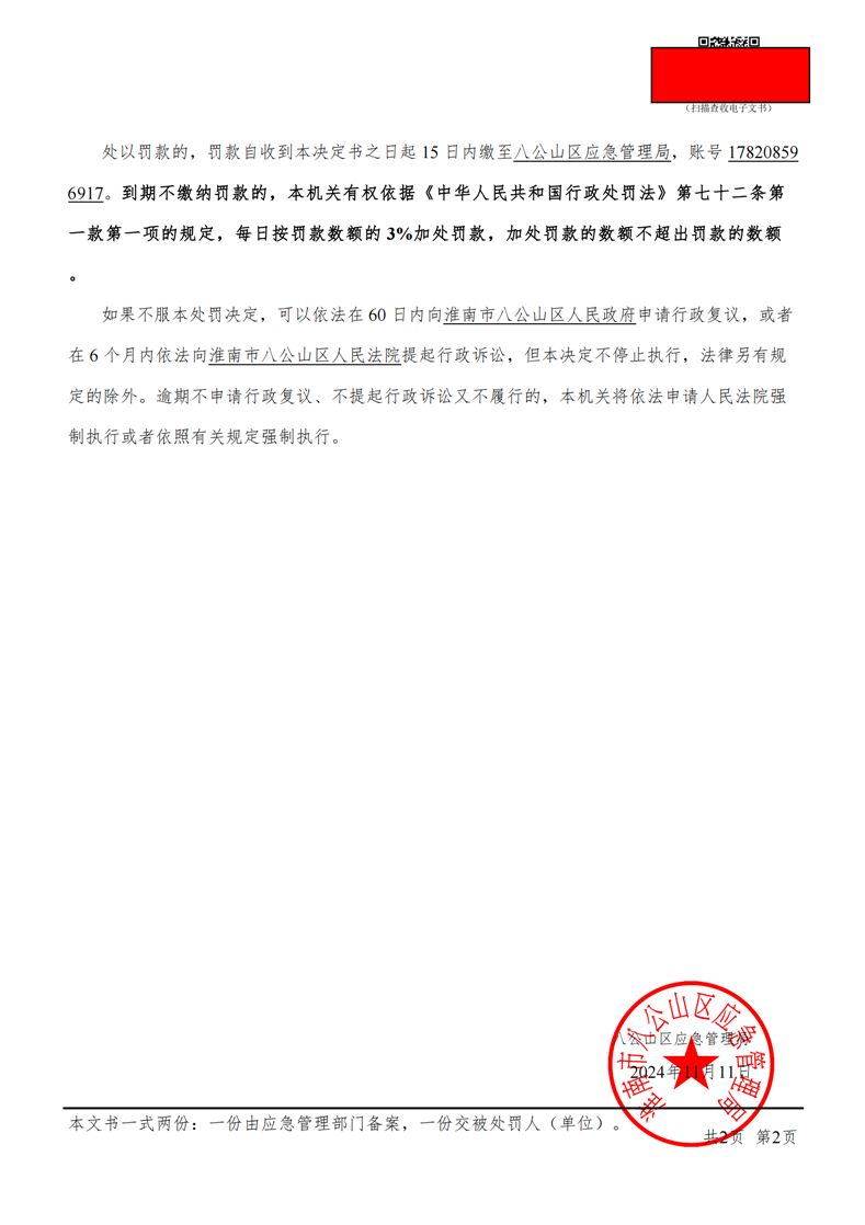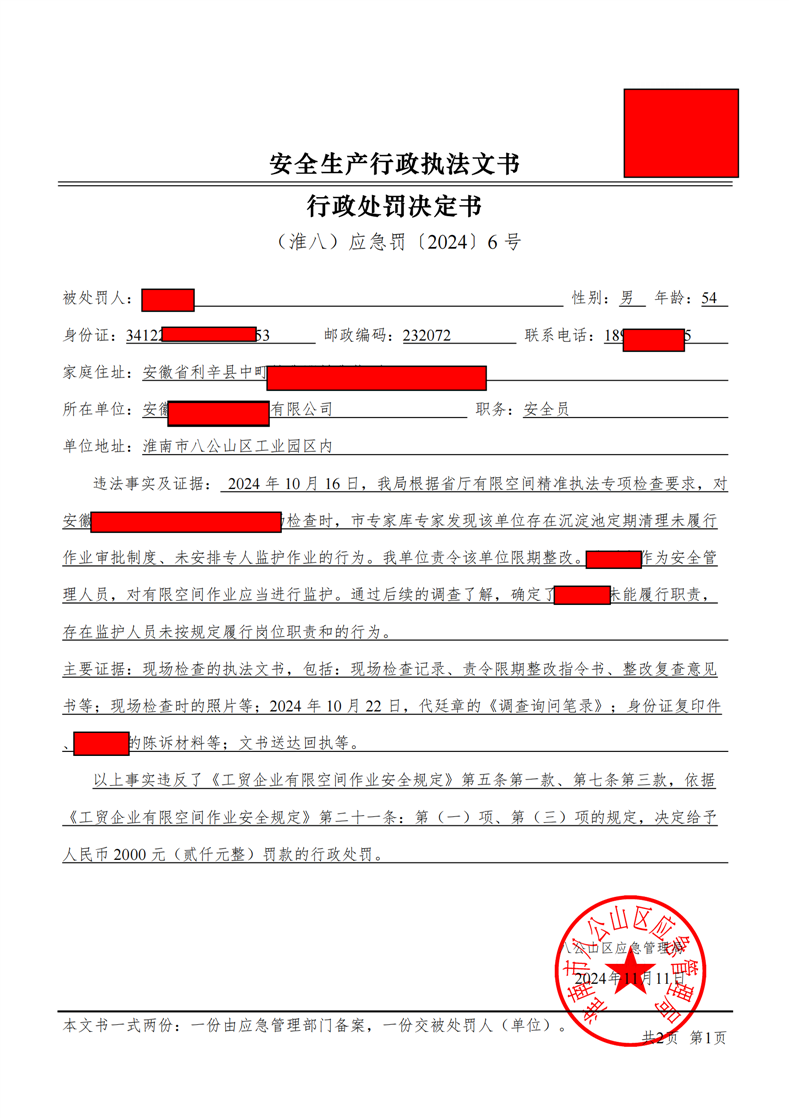 行政处罚决定书(个人)(淮八)应急罚〔2024〕6号