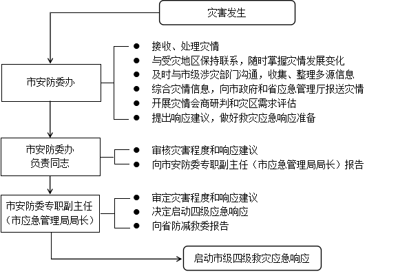 灾害发生后,市安防委办经分析评估,认定灾情达到启动标准,市安防委专职副主任(市应急管理局局长)决定启动四级响应,向省防减救委报告。