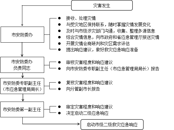 灾害发生后,市安防委办经分析评估,认定灾情达到启动标准,向市安防委提出启动二级响应的建议,市安防委第一副主任决定启动二级响应,并向市委、市政府和省防减救委报告。